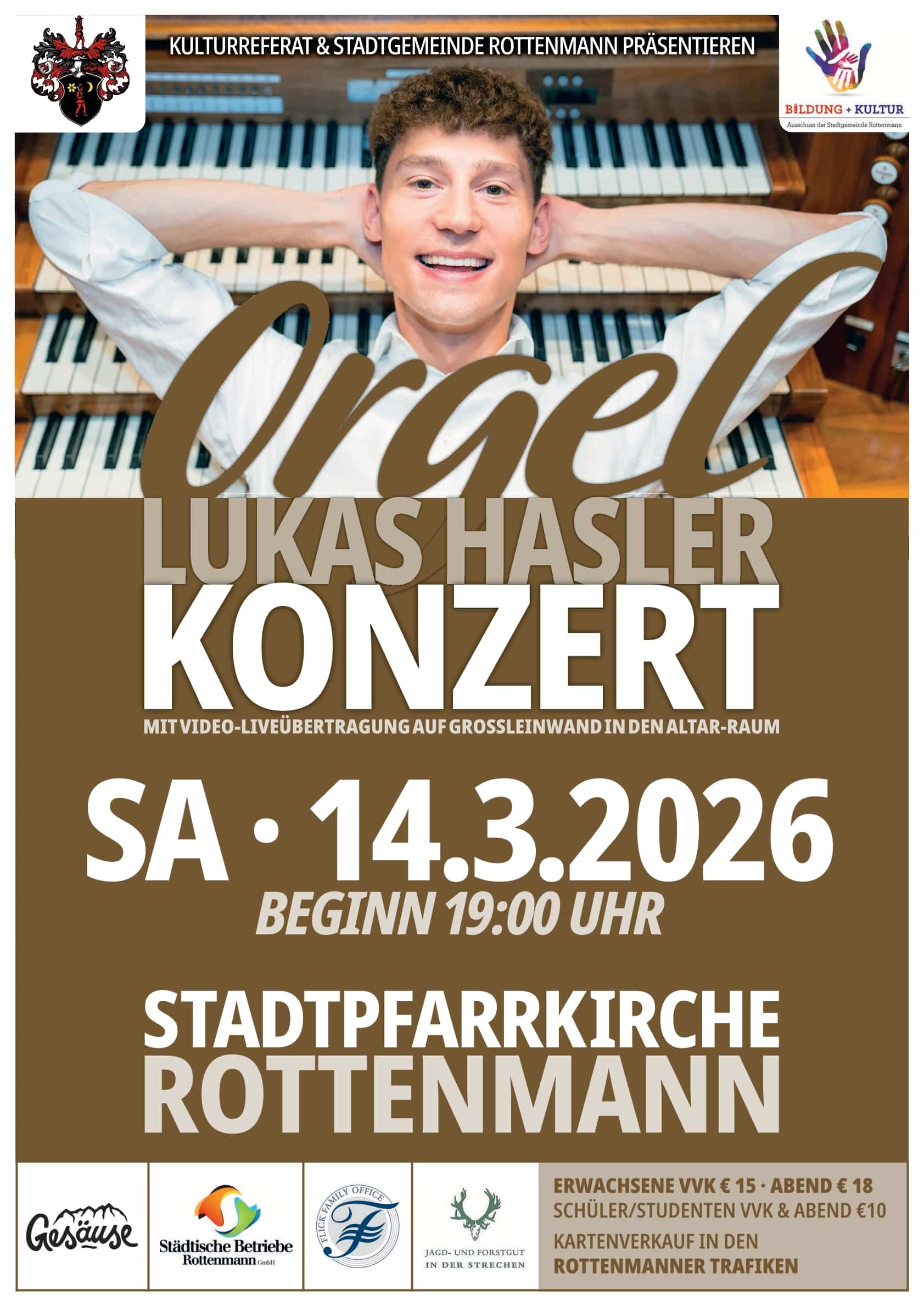 Orgelkonzert } March 14, 2026, 19:00 Location: Röm.-kath. Stadtpfarrkirche, Rottenmann, Austria Link to more information Details: Featuring organ compositions of Bach, Beethoven, Film Music News from Facebook News from Facebook